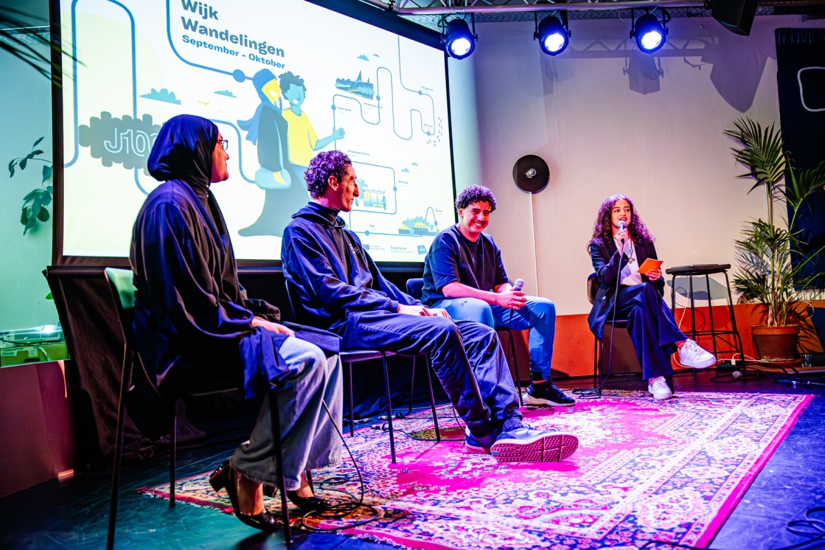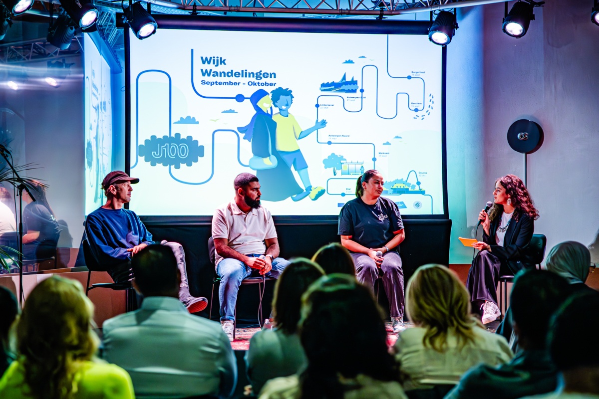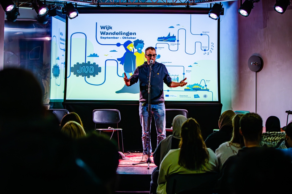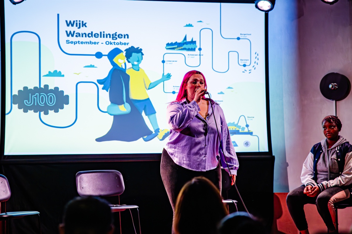 Filip Balthau (JES), één van de bezielers van J100, leidde het project van de wijkwandelingen in en deed - letterlijk - zijn petje af voor de jongeren en jeugdwerkers van Antwerpen. Gastvrouw en moderator van de Kick-off, Yousra Llouh, voerde boeiende gesprekken met jeugdwerkers Mourad Chiboub (JES), Sabah Cherik (Kras) en Thomas Surmont (JES), en met de J100 jongeren Ibtissam, Mohammed en Nabil. Fifi en Eva Heart van Moving Ground brachten catchy songs en Marwaan Ouali aka Pizza sloot de avond af met een krachtige rap en mic drop.