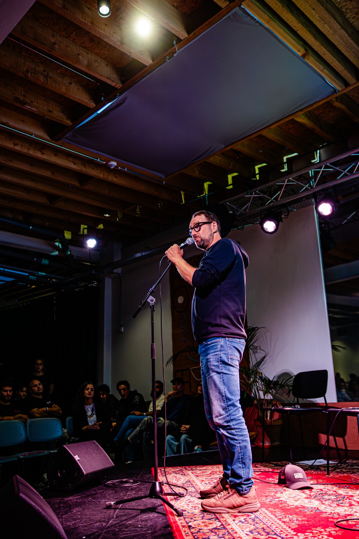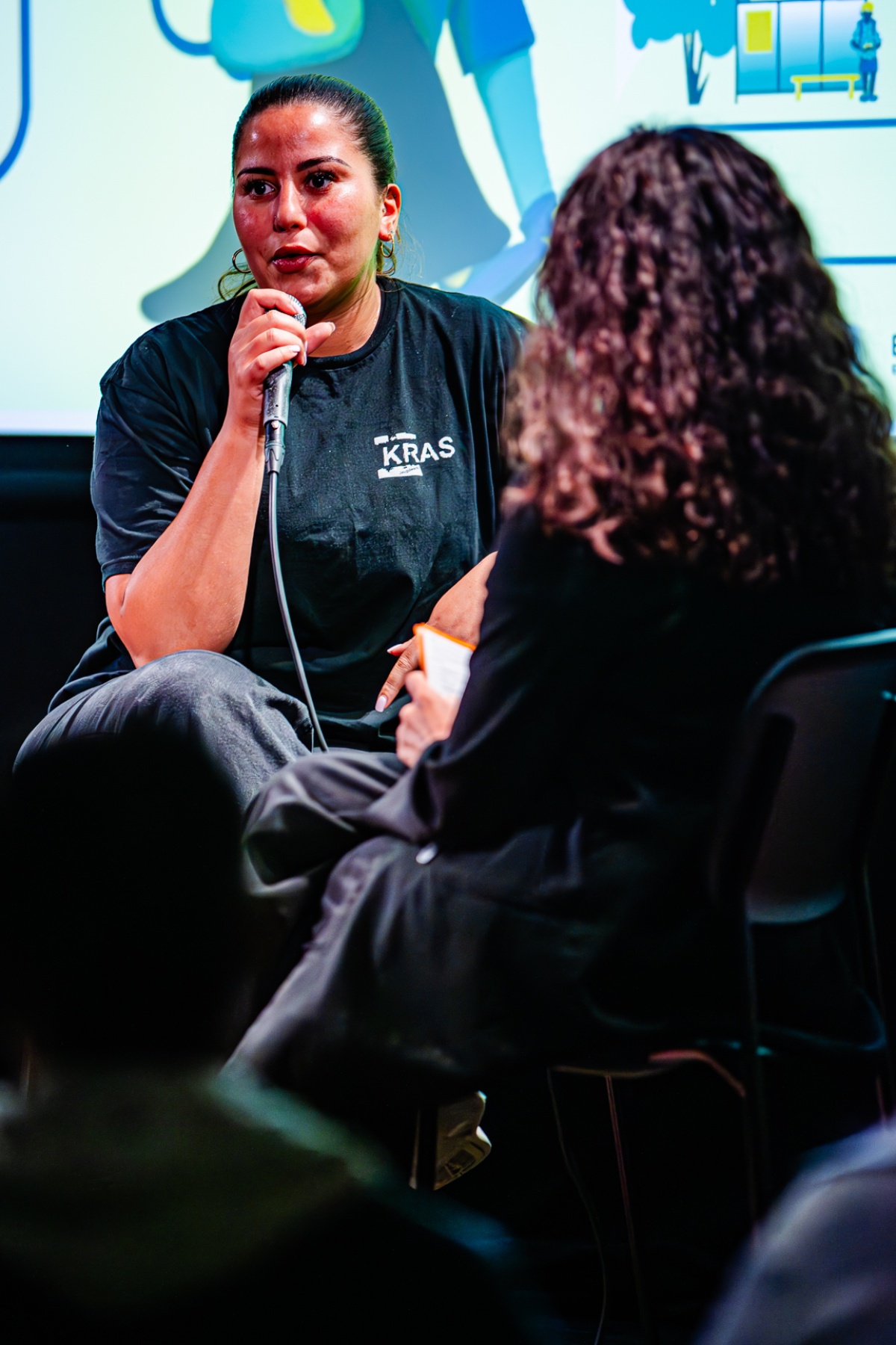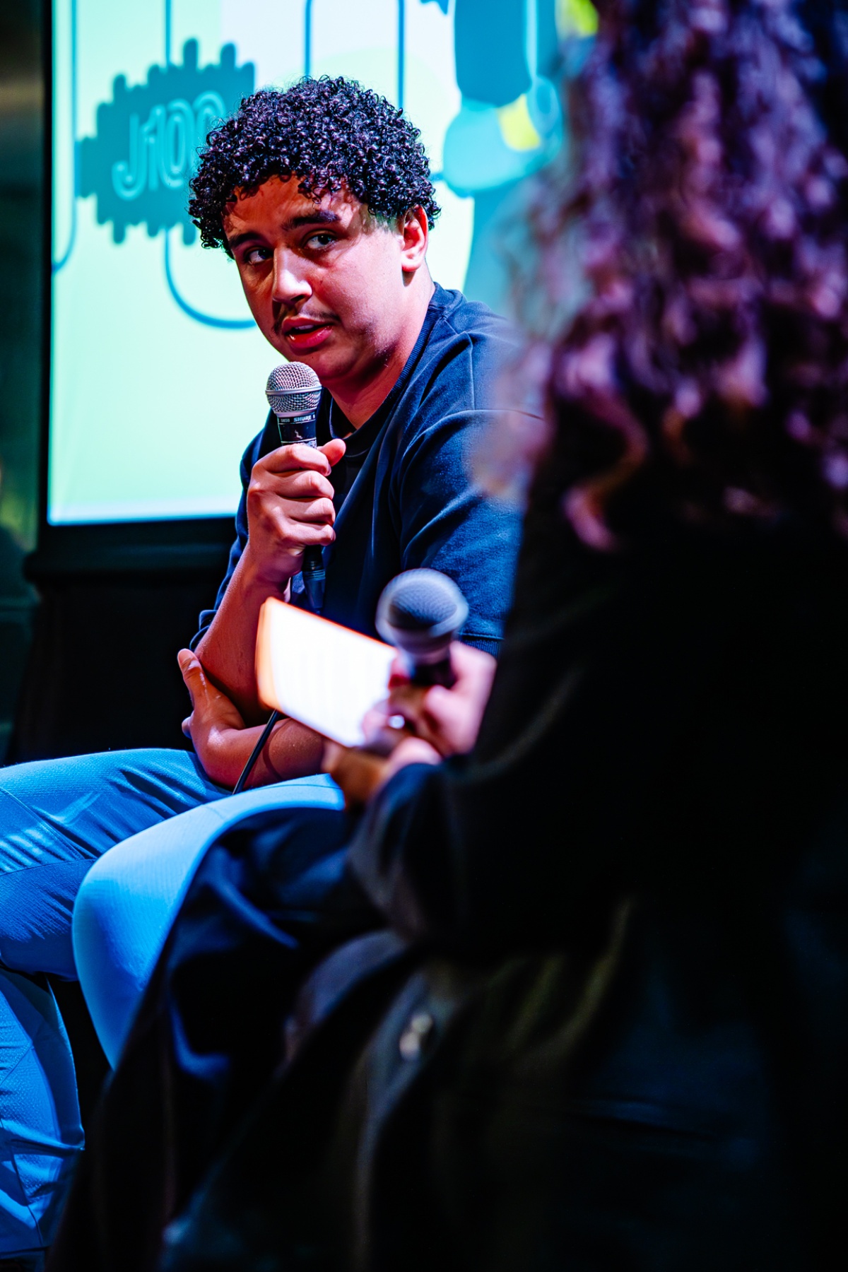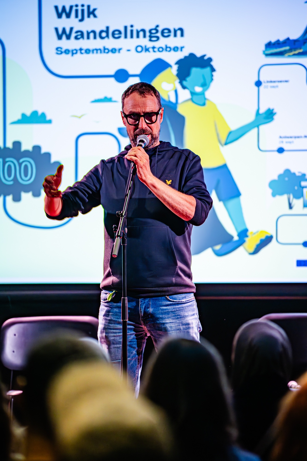 Filip Balthau (JES), één van de bezielers van J100, leidde het project van de wijkwandelingen in en deed - letterlijk - zijn petje af voor de jongeren en jeugdwerkers van Antwerpen. Gastvrouw en moderator van de Kick-off, Yousra Llouh, voerde boeiende gesprekken met jeugdwerkers Mourad Chiboub (JES), Sabah Cherik (Kras) en Thomas Surmont (JES), en met de J100 jongeren Ibtissam, Mohammed en Nabil. Fifi en Eva Heart van Moving Ground brachten catchy songs en Marwaan Ouali aka Pizza sloot de avond af met een krachtige rap en mic drop.